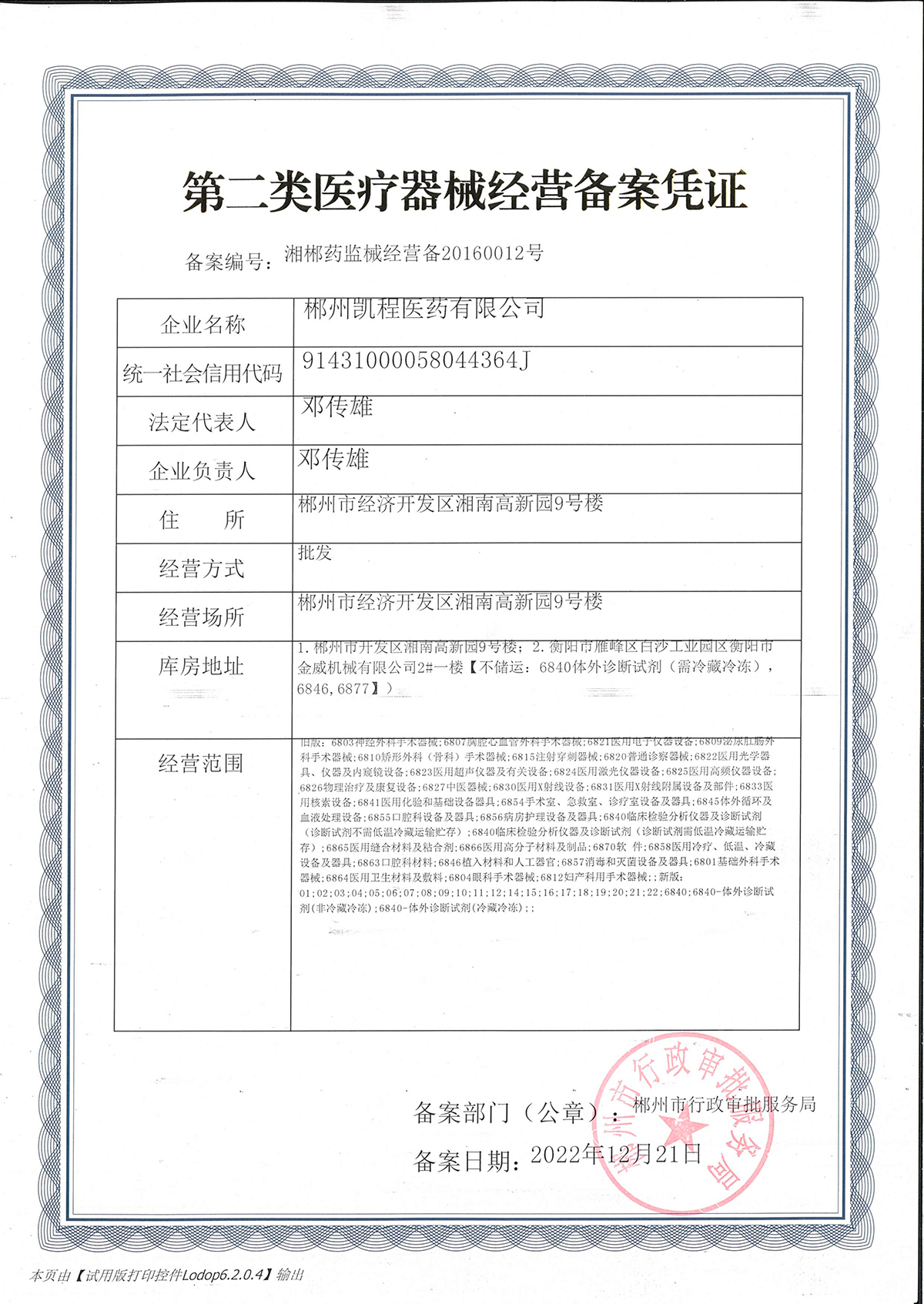 第二類(lèi)醫(yī)療器械經(jīng)營(yíng)備案憑證:湘郴藥監(jiān)械經(jīng)營(yíng)備20160012號(hào)